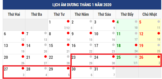2. Tết Âm lịch 07 ngày (Từ thứ 5 ngày 23/01/2020 đến hết ngày 29/01/2020 tức là từ ngày 29 tháng Chạp năm Kỷ Hợi đến hết ngày mùng 5 tháng Giêng năm Canh Tý).