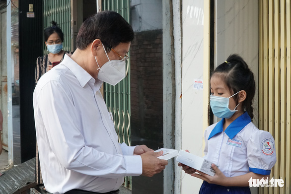 Bí thư Quận ủy Bình Thạnh Vũ Ngọc Tuất động viên cháu Hân (học sinh lớp 3) - Ảnh: ĐAN THUẦN