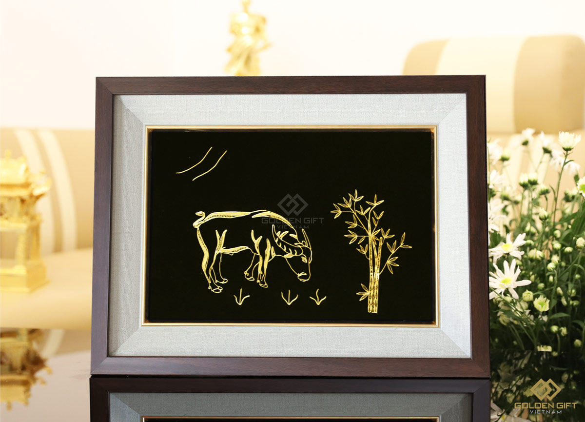 Tranh trâu mạ vàng là mẫu tranh mới nhất của Golden Gift, tranh trâu có 2 kiểu dáng là trâu đứng đang gặm cỏ và trâu nằm tư thế khoan thai dưới bóng luỹ tre, là những hình ảnh tiêu biểu và gần gũi với đời sống văn hoá người Việt Nam. Cũng là mẫu chế tác quà tặng độc đáo cho năm mới, Tân Sửu 2021.