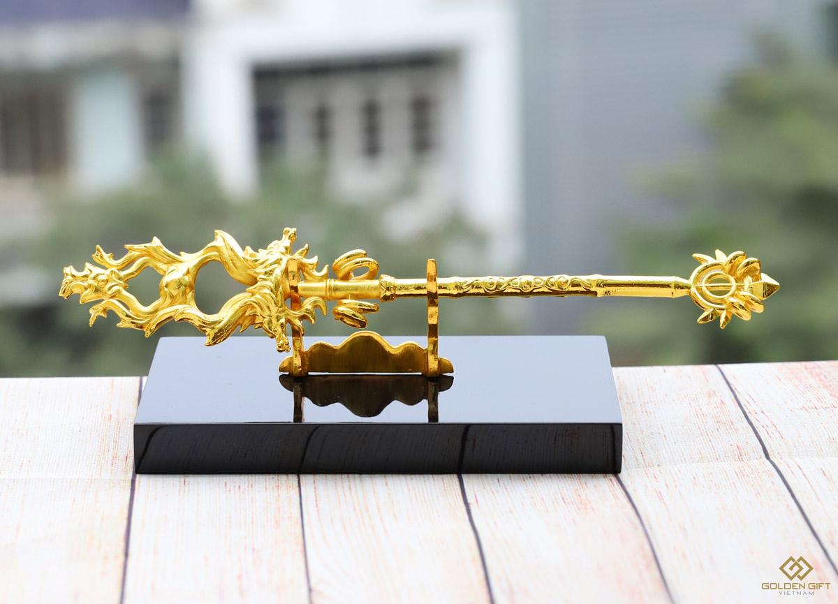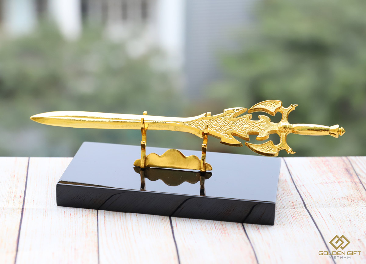 Thanh kiếm mạ vàng trong bộ giải thưởng cuộc thi “Tuyệt thế chiến thần” được khắc hoạ tỉ mỉ từng đường nét, chi tiết văn hoa nổi theo phong cách kiếm hiệp được tái hiện trong game