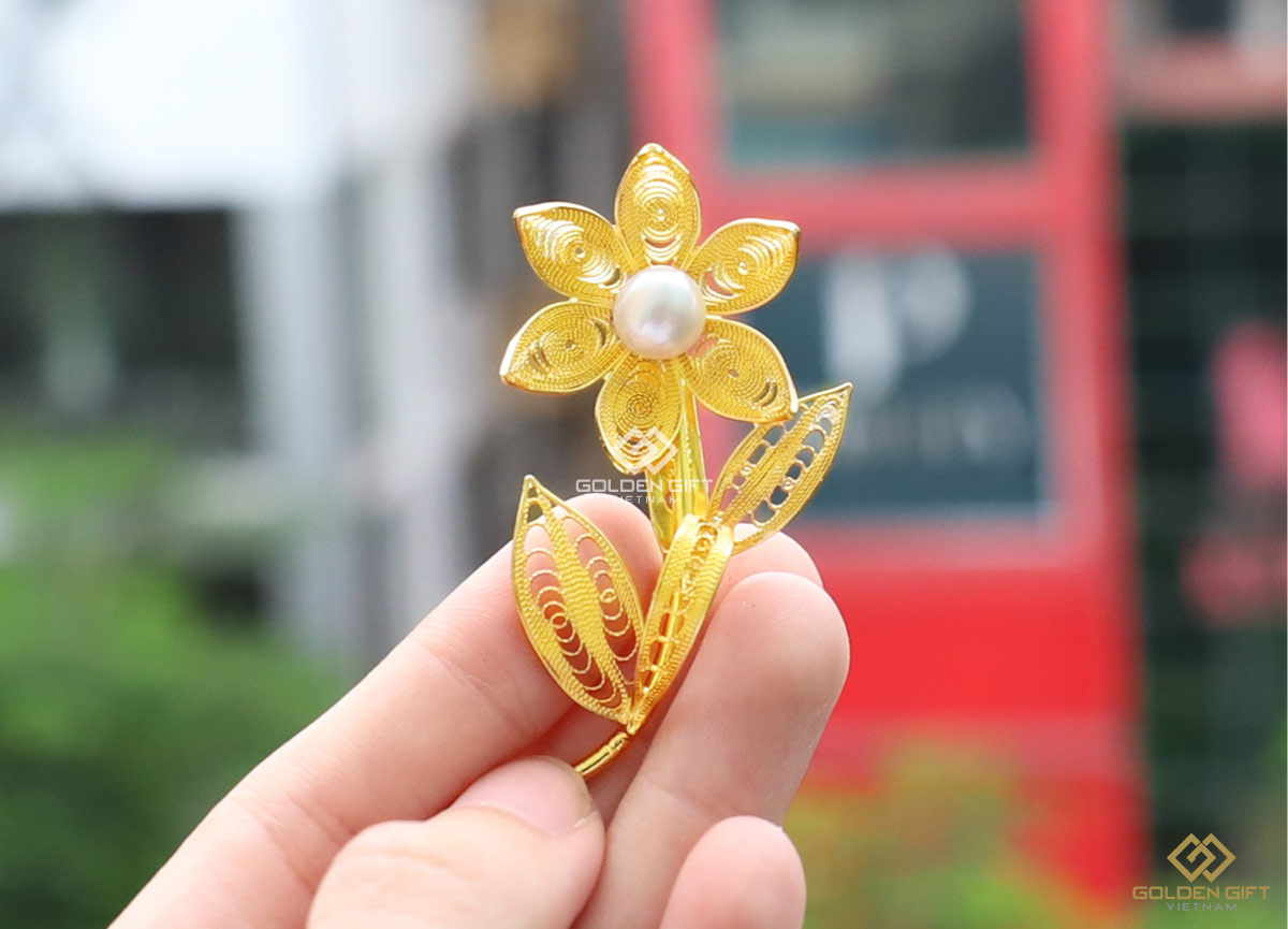 Hoa cài áo ngọc trai do Golden Gift Việt Nam chế tác từ sợi kim loại quý và phủ vàng ròng bên ngoài sẽ đem đến sự thanh lịch, sang trọng và quý phái cho người sử dụng. Đây là món quà tết tặng cô giáo ý nghĩa.