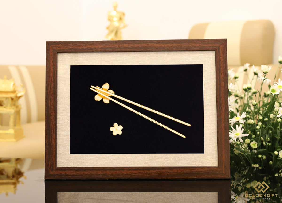 Tranh đôi đũa mạ vàng gắn giá đỡ hoa mai là quà tặng cao cấp dành tặng cho bạn thân thay lời chúc hạnh phúc bạn muốn gửi gắm.