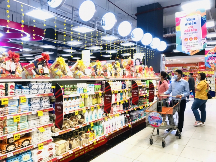 Các gian hàng bày bán giỏ quà tết tại siêu thị Co.opxtra