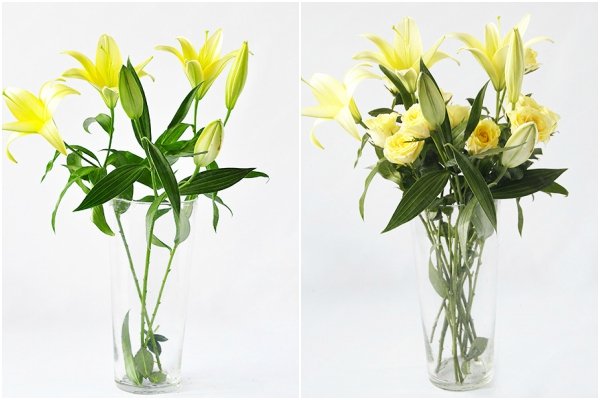 Bước 1: Cắm hoa ly vàng vào lọ đầu tiên, chỉnh sao cho hoa tỏa đều các hướng. Đặc biệt những ai chưa có kinh nghiệm đừng quên ướm thử độ dài của cành hoa trước khi cắt để tránh cắt xong mới thấy thiếu chiều cao.