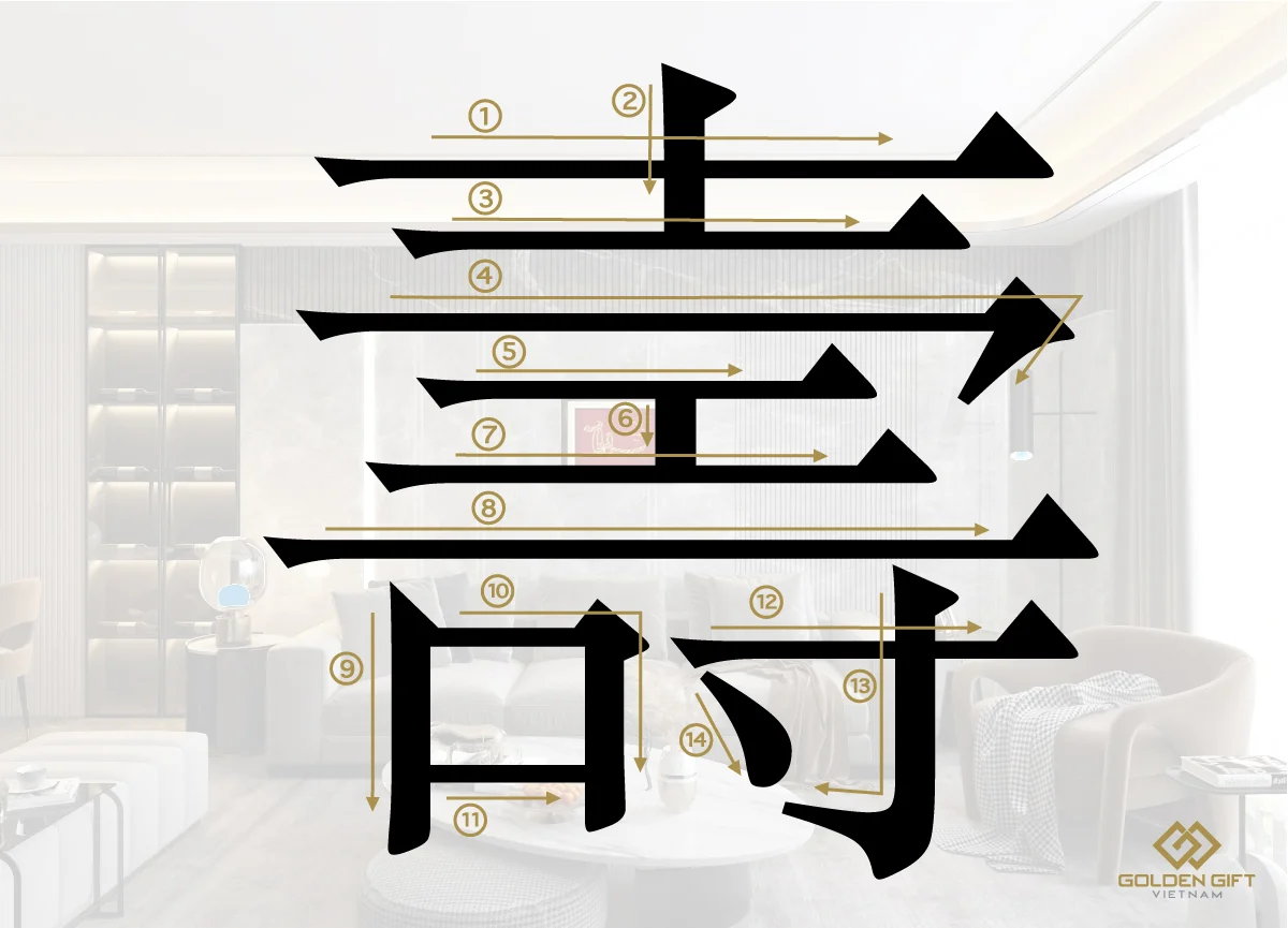 Chữ Thọ gồm có 14 nét, các nét được liên kết với nhau. Để bạn dễ hình dung cách viết, Golden Gift Việt Nam đã làm các thứ tự cách viết chữ Thọ trong tiếng Hán theo từng nét ở ảnh dưới đây: