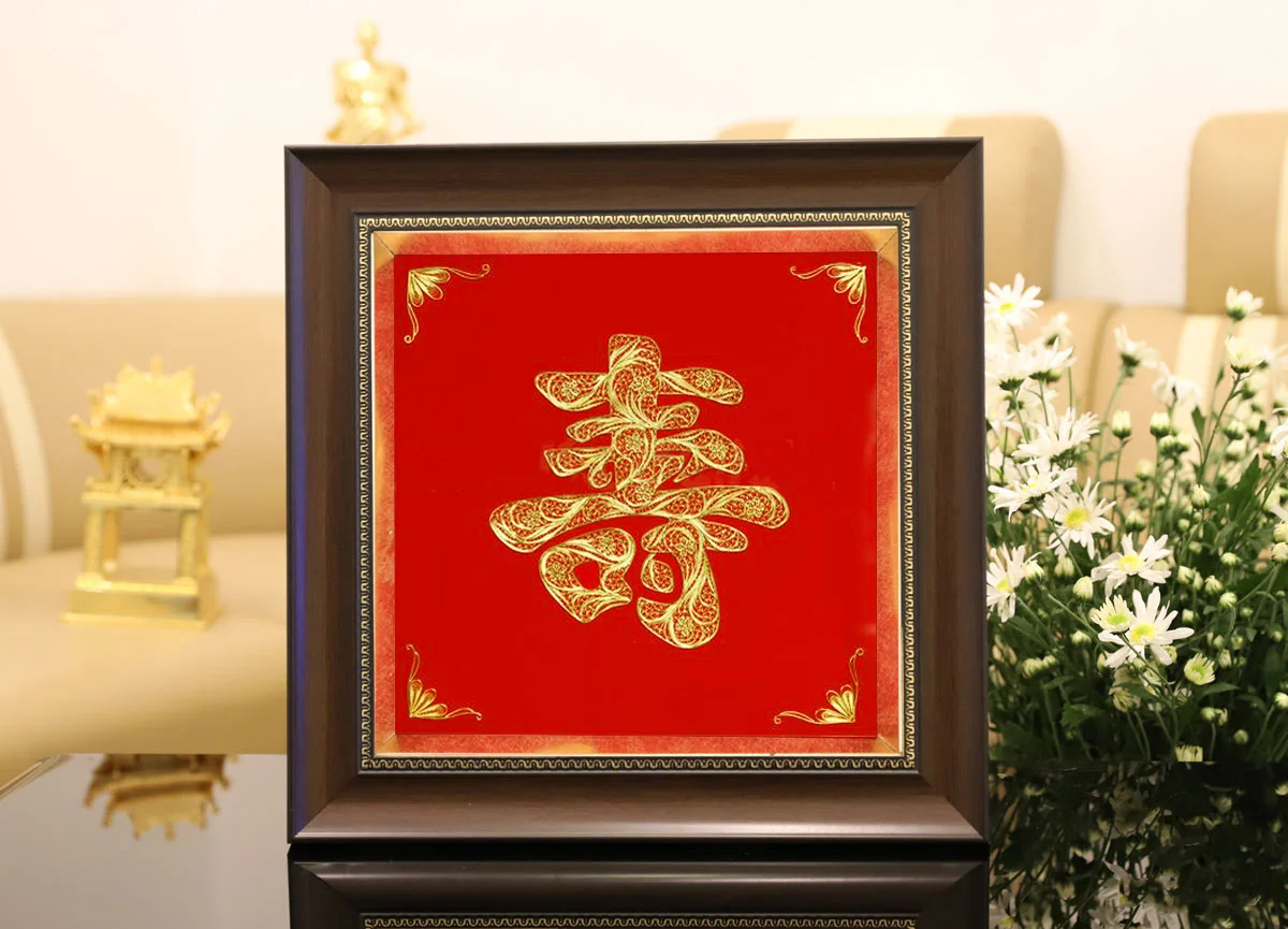 Đặc biệt tranh chữ Thọ mạ vàng do Golden Gift Việt Nam chế tác được khách hàng ưa chuộng hơn cả. Tranh được chế tác thủ công từ kim loại quý và phủ vàng ròng bên ngoài, khiến bức tranh thêm phần sang trọng.