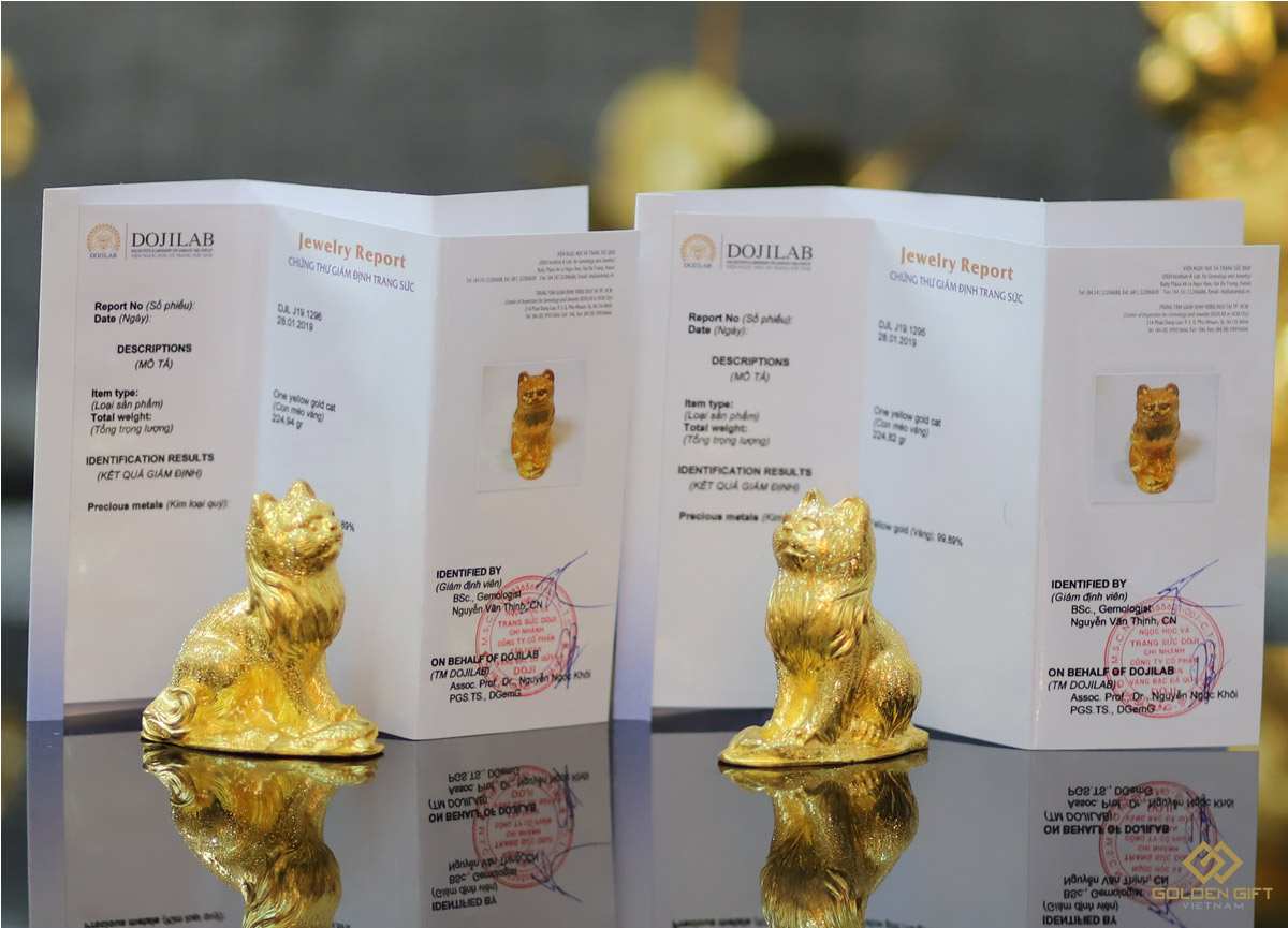 Được biết đến là thương hiệu chế tác nên Đôi mèo đúc vàng nguyên khối nói trên, Golden Gift Việt Nam hiện nay đã định vị được uy tín, an tâm về chất lượng của các sản phẩm quà tặng mạ vàng. Tượng Mèo phong thủy mạ vàng cũng chính là một trong 12 quà vàng thuộc bộ sưu tập linh vật Tết của thương hiệu này.