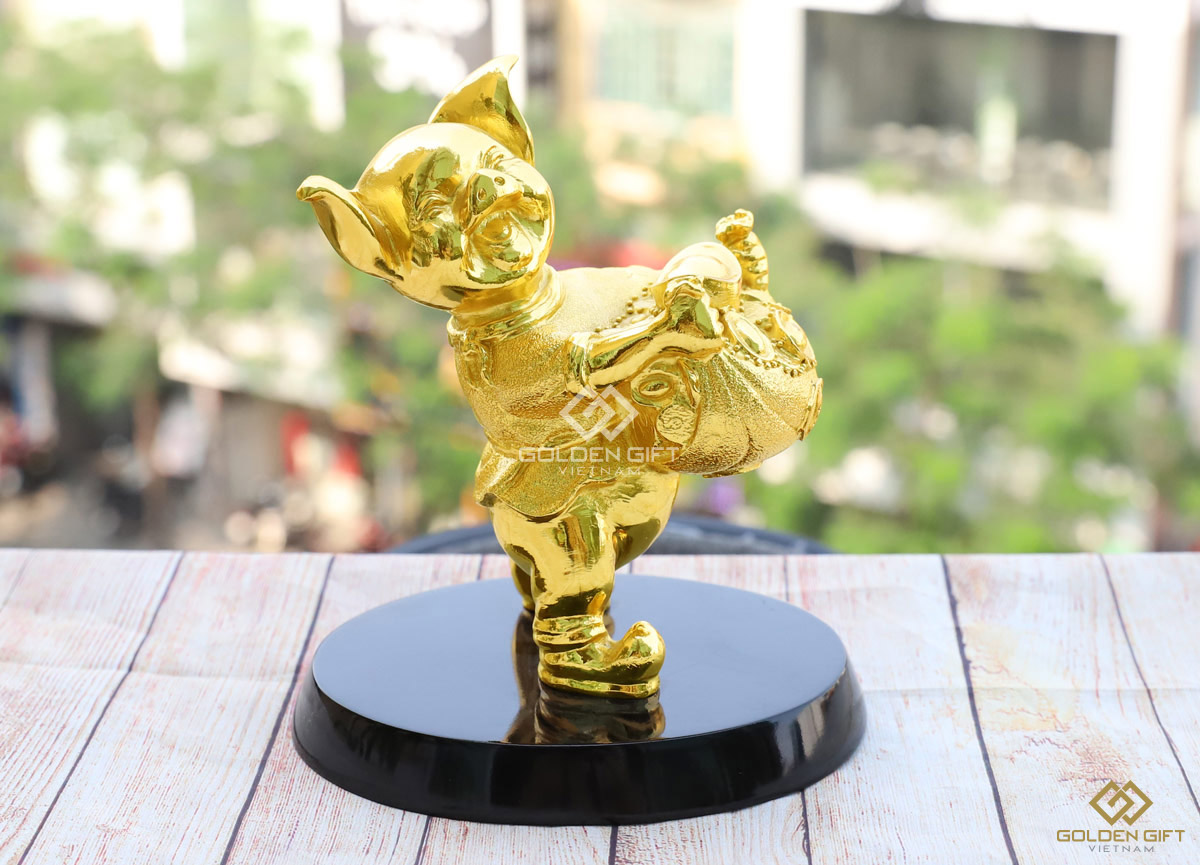 Tượng Heo vàng Phú Quý: Mang ý nghĩa cầu chúc một năm may mắn, tài lộc, thích hợp để tặng sếp, đối tác, người thân trong dip lễ Tết, tân gia. Mẫu quà được thiết kế cách điệu với hình dáng của chú Heo với dáng đi khệ nệ ôm túi vàng, khuôn mặt tươi, mãn nguyện với thành quả của một năm qua.